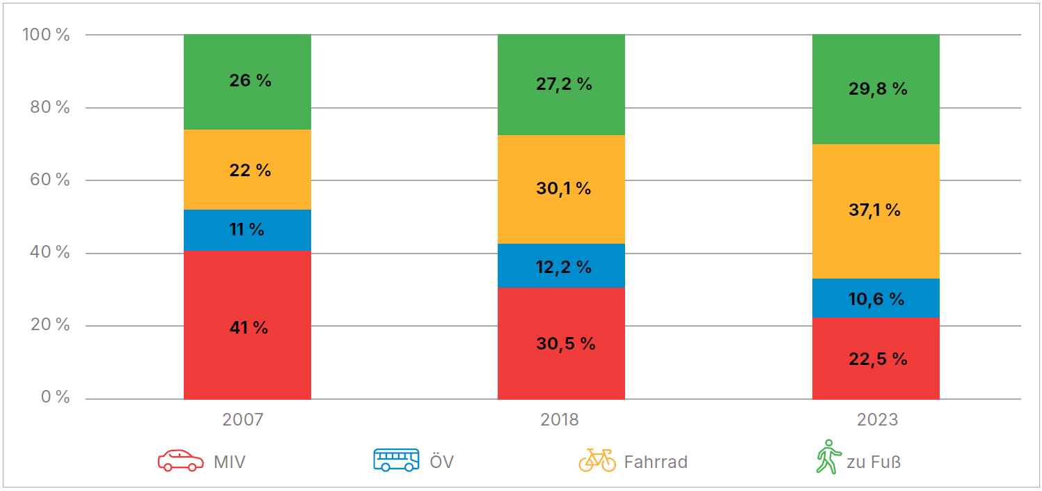 Der Anteil an Wegen, die im Alltag zu Fuß zurückgelegt werden, liegt in Konstanz bei einem Gesamtanteil von rund 30 %. Besonders gestiegen ist der Anteil im Radverkehr: Mit dem Fahrrad wurden 2023 ganze 37 % der Wege zurückgelegt – 7 Prozentpunkte mehr als 2018 und 15 mehr als 2007. Der Anteil an mit dem Pkw zurückgelegten Wegen konnte seit der Erhebung im Jahr 2007 von 41 % bzw. rund 31 % im Jahr 2018 auf rund 23 % gesenkt werden. Öffentliche Verkehrsmittel wurden geringfügig weniger genutzt. Der Anteil am Gesamtverkehr ist von 12 % auf 11 % gesunken, aber bei den Wegen mit 3 bis 10 km Länge nutzten 19 % den ÖPNV, bei Wegen über 10 km sogar 32 %.