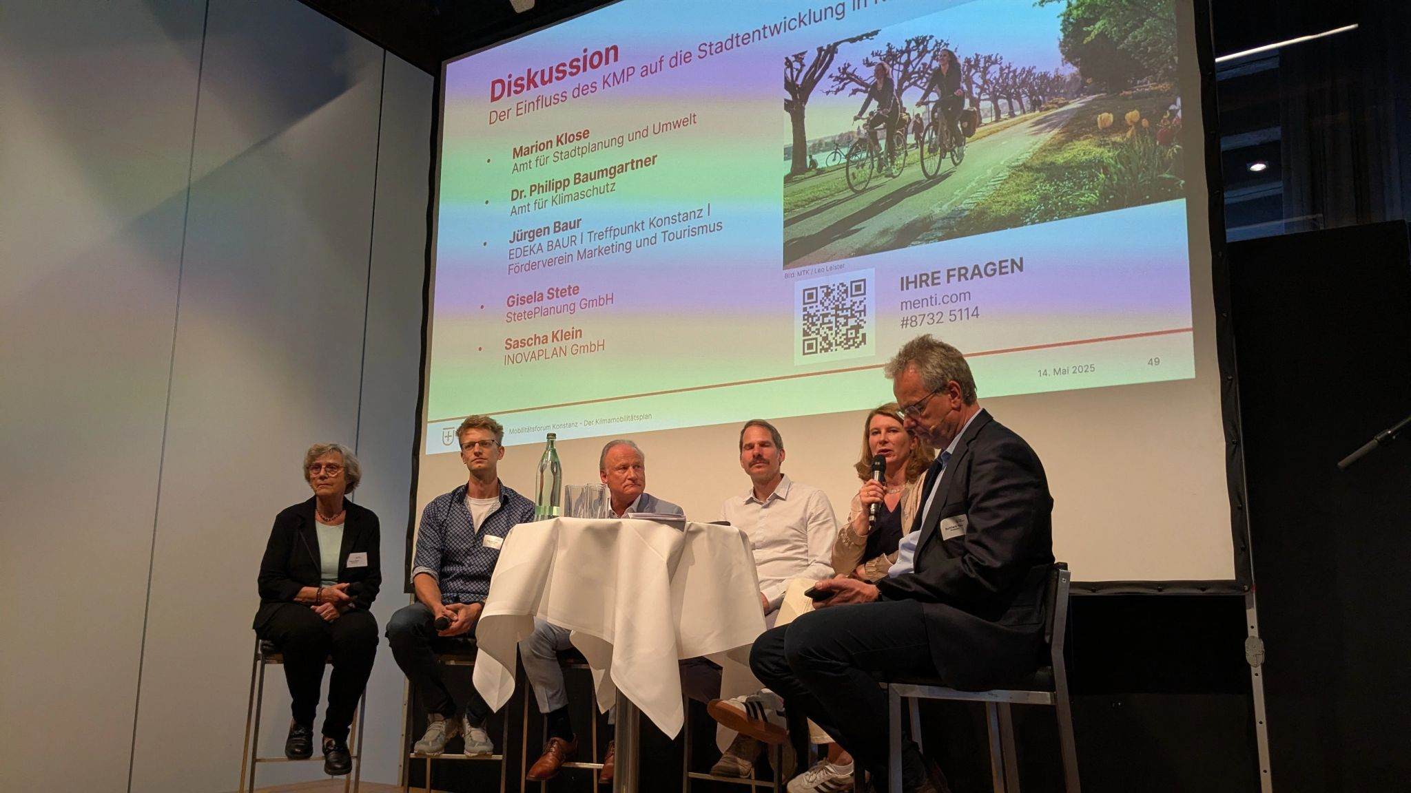 Im Anschluss daran gab es eine anregende Diskussion gemeinsam mit Gisela Stete, deren Stadtplanungsbüro 2010-2013 den Masterplan Mobilität für Konstanz erarbeitet hatte und deren Büro aktuell den KMP als Teil einer Bürogemeinschaft verfasst hat, Sascha Klein, Jürgen Baur, von EDEKA Baur als Vertreter des Einzelhandels und Vorsitzender des Fördervereins Marketing und Tourismus in Konstanz, Philipp Baumgartner, Leiter des Amts für Klimaschutz, und Marion Klose, Leiterin des Amts für Stadtplanung und Umwelt, um Mobilität in Konstanz aus verschiedenen Blickwinkeln zu beleuchten.